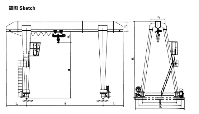 MH型3t單梁門式起重機(jī)是中小型可帶懸臂的簡易3t門式起重機(jī),3t電動(dòng)葫蘆采用CDI、MDI等形式,主梁是U型槽板與工字鋼焊接而成的組合梁,大車運(yùn)行機(jī)構(gòu)采用三合一驅(qū)動(dòng)裝置。其適用起重量為3t,適用跨度為7.5-30米,工作環(huán)境溫度在-25—+40℃范圍內(nèi)。其結(jié)構(gòu)簡單、安裝、使用、維修方便,多用于工廠、貨場、碼頭、水電站等使用頻度低或額定起重量起吊次數(shù)少的場所。